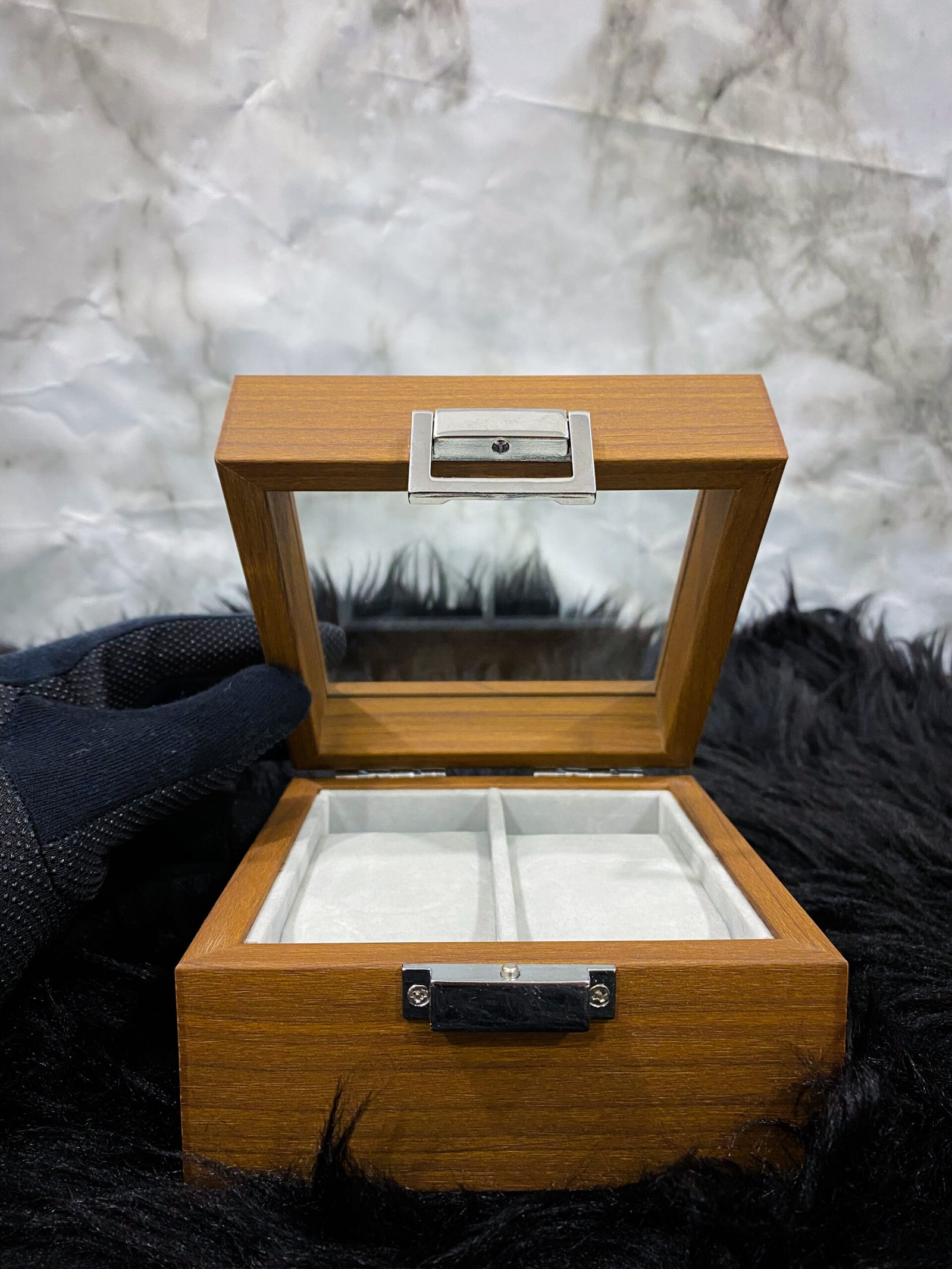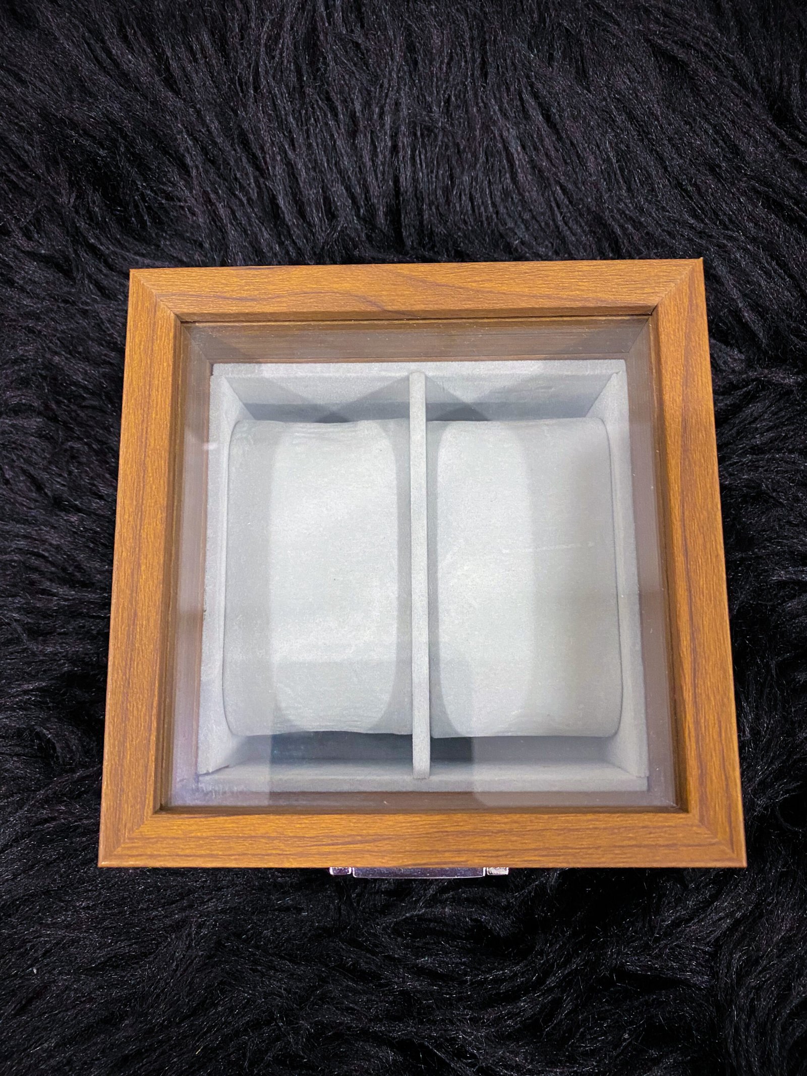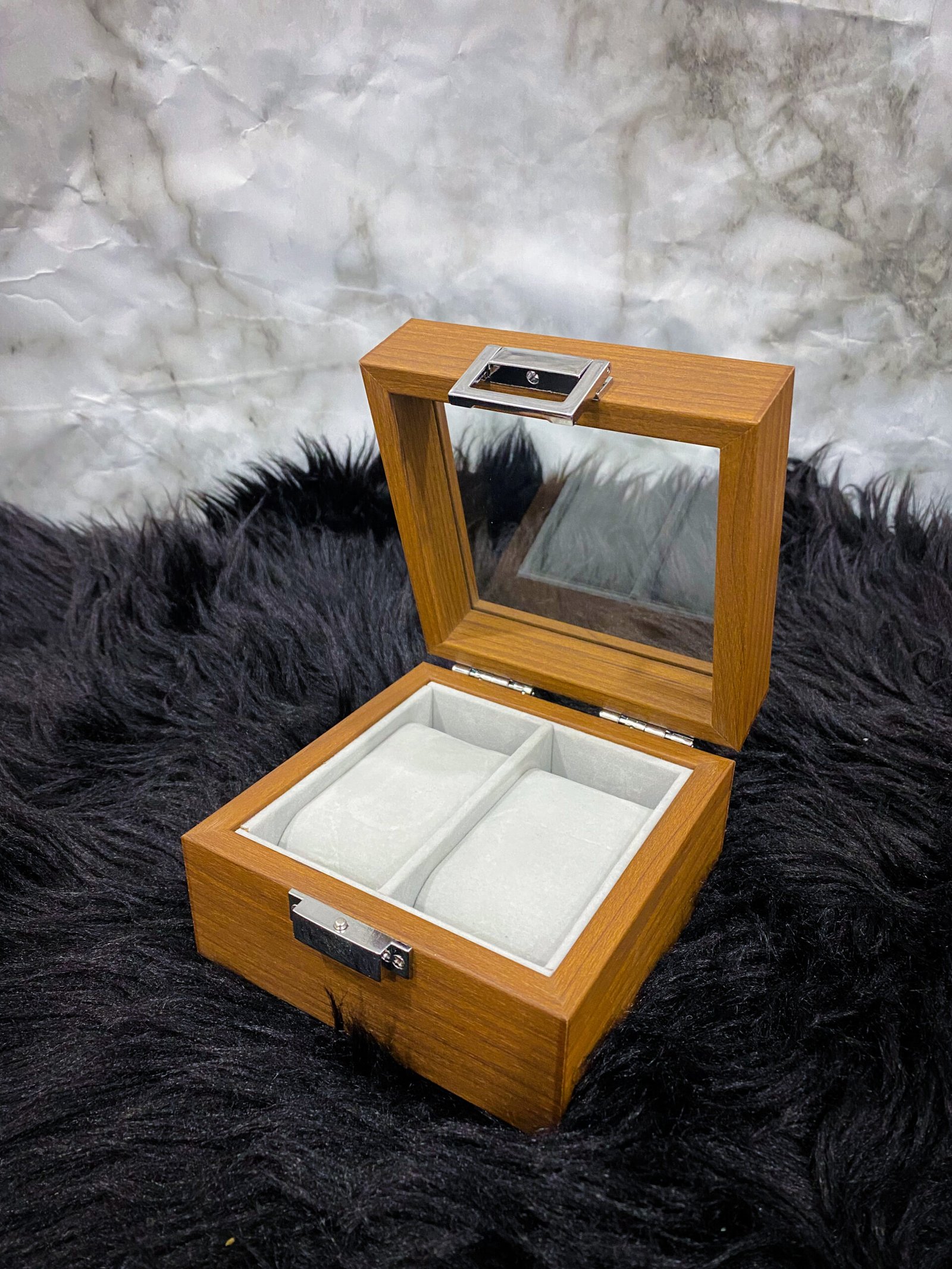 Boîte en bois élégante avec couvercle vitré et intérieur en velours, idéale pour ranger et exposer deux montres avec style.