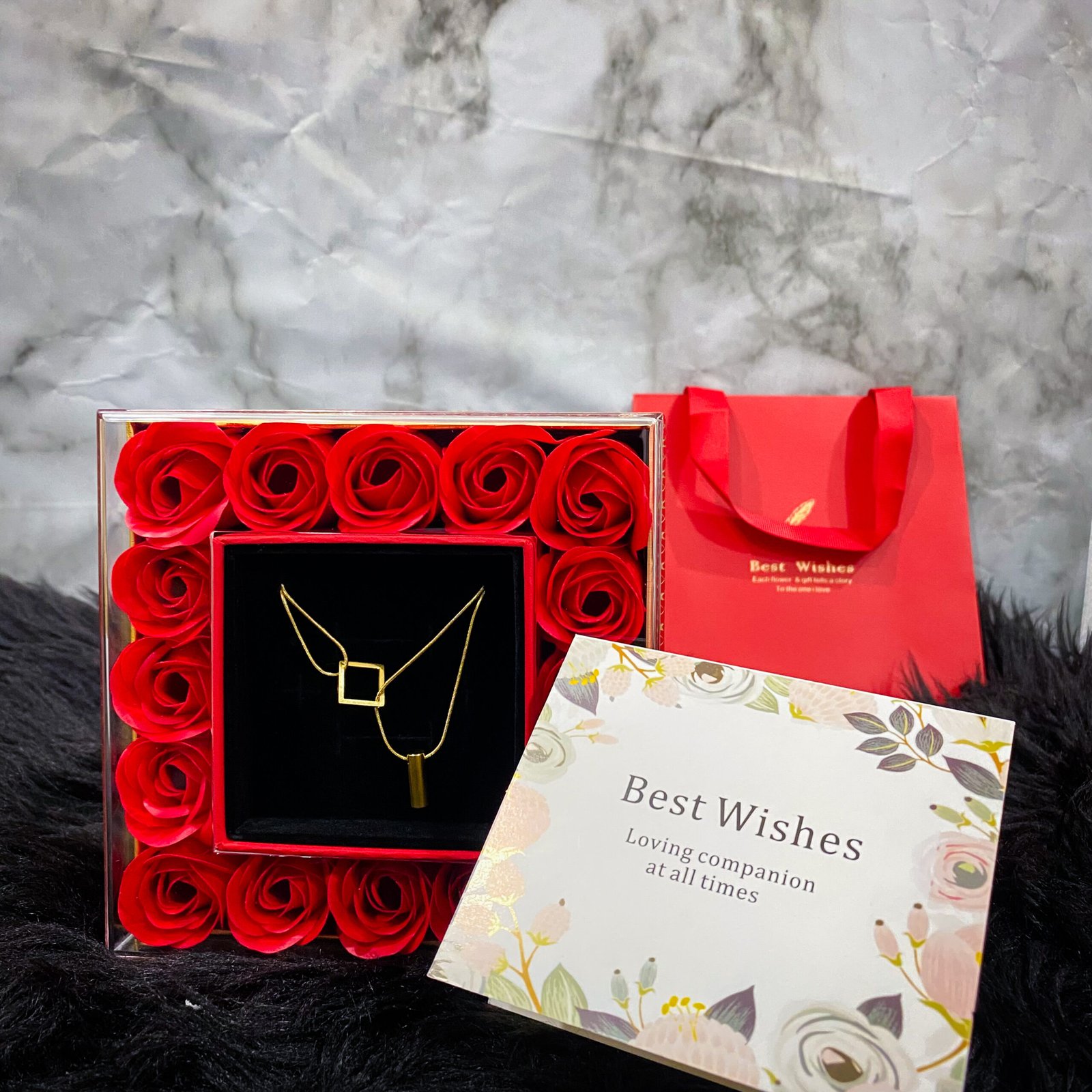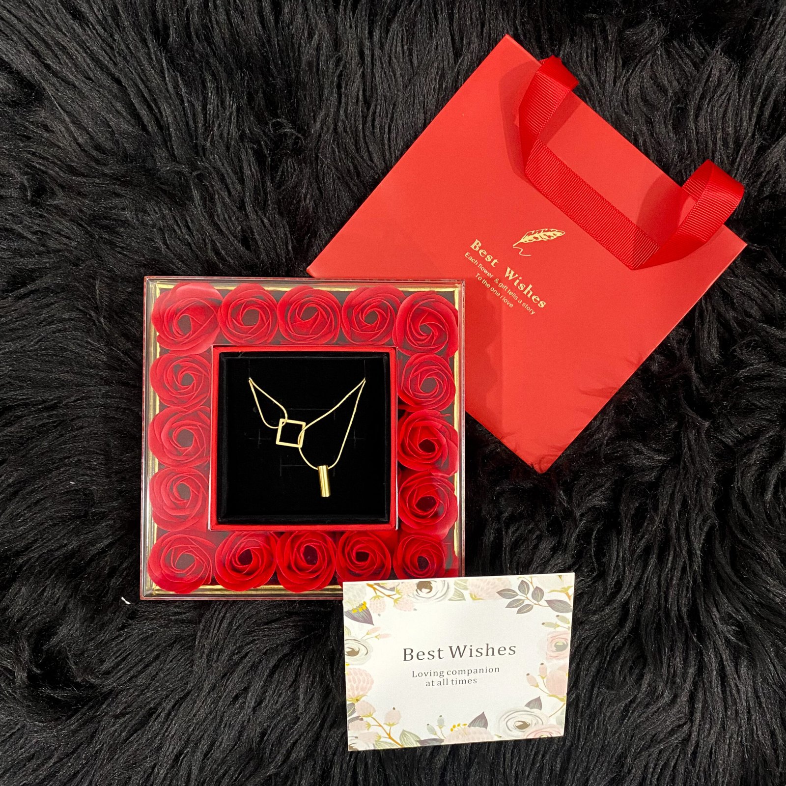 Coffret Cadeau Romantique pour Femme : Collier Pendentif & Écrin de Roses