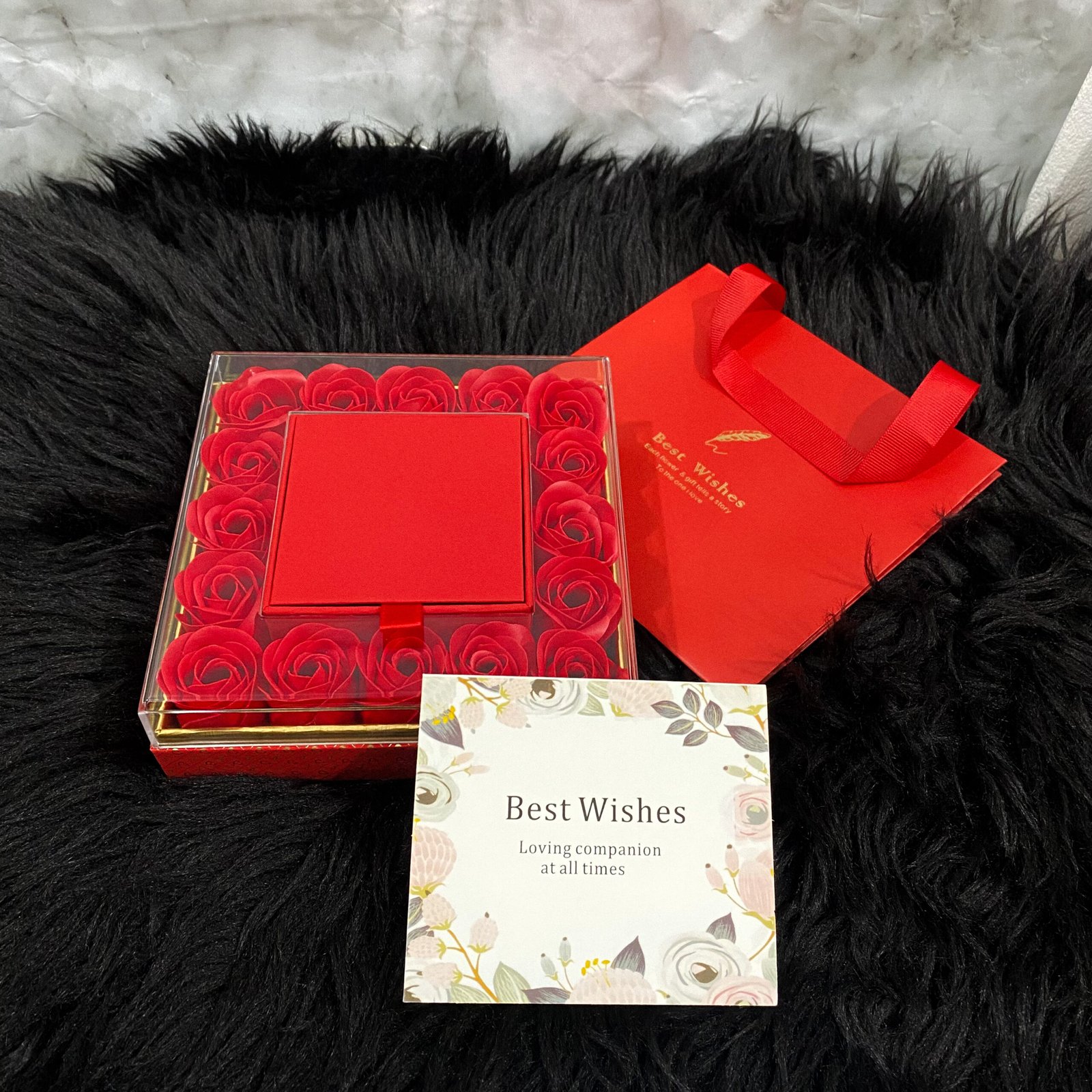 Un Ensemble Prêt à Offrir : Pour une expérience parfaite, le coffret est accompagné d’un sac cadeau rouge assorti et d’une jolie carte de vœux « Best Wishes ». Vous n’avez plus qu’à y ajouter votre touche personnelle avec un mot doux.