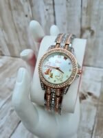 Élégante et onirique, cette montre captive le regard par ses détails travaillés. Le cadran argenté, protégé par une lunette doublement sertie de strass, met en scène de délicats papillons dorés qui apportent une touche de fantaisie raffinée à votre style.