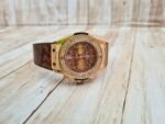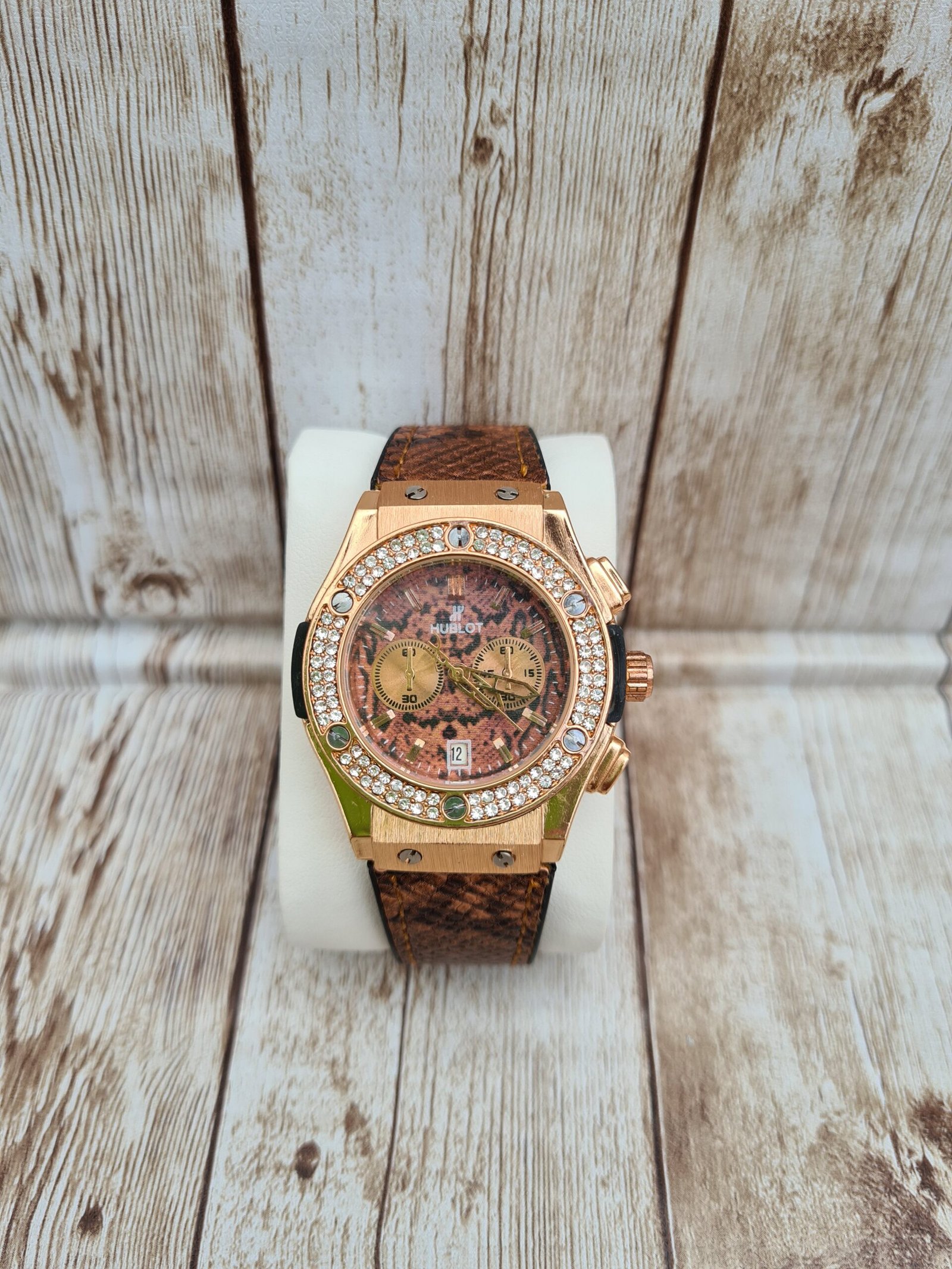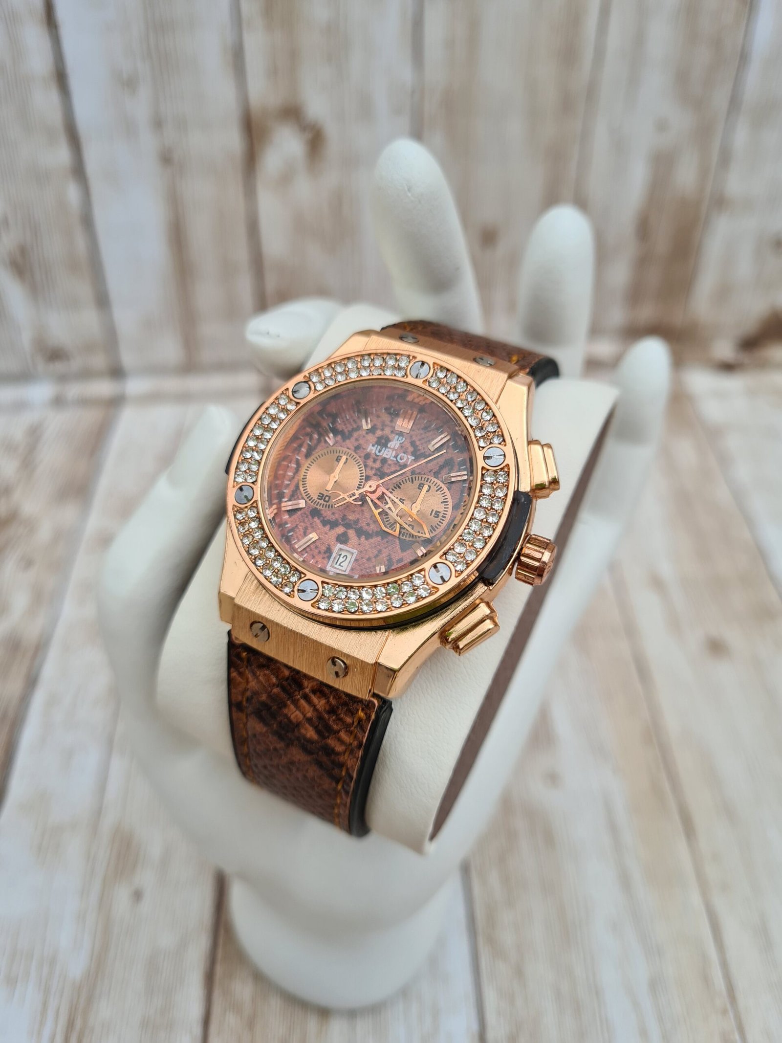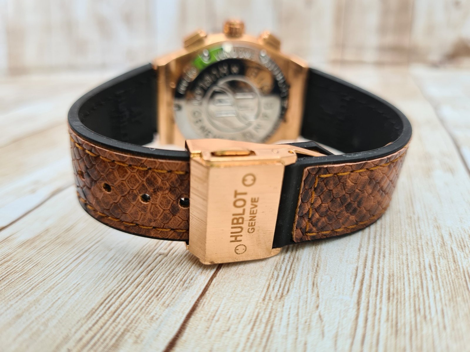 Montre Chronographe Hublot Rose Gold – Lunette Diamantée & Bracelet Cuir Exotique