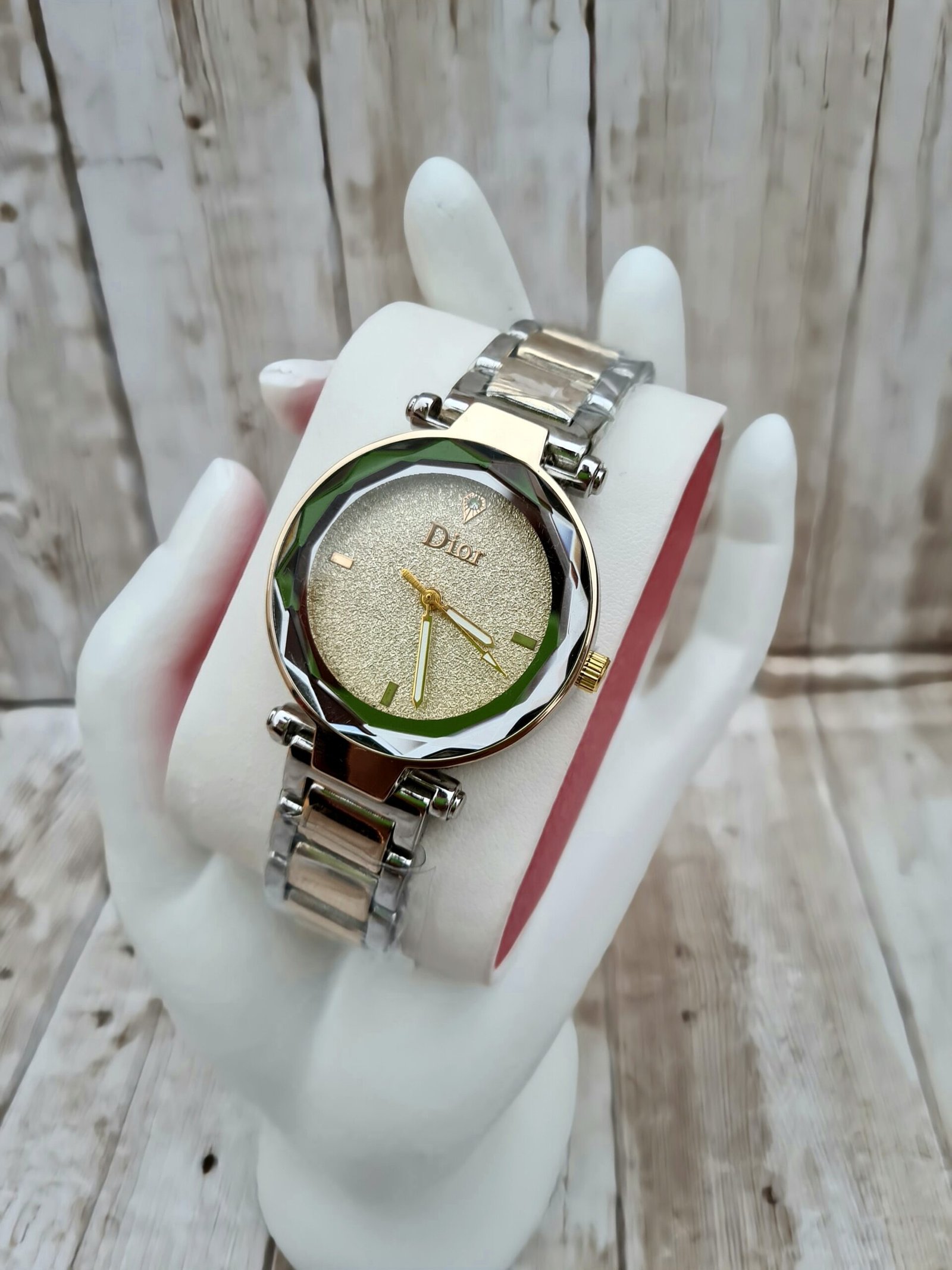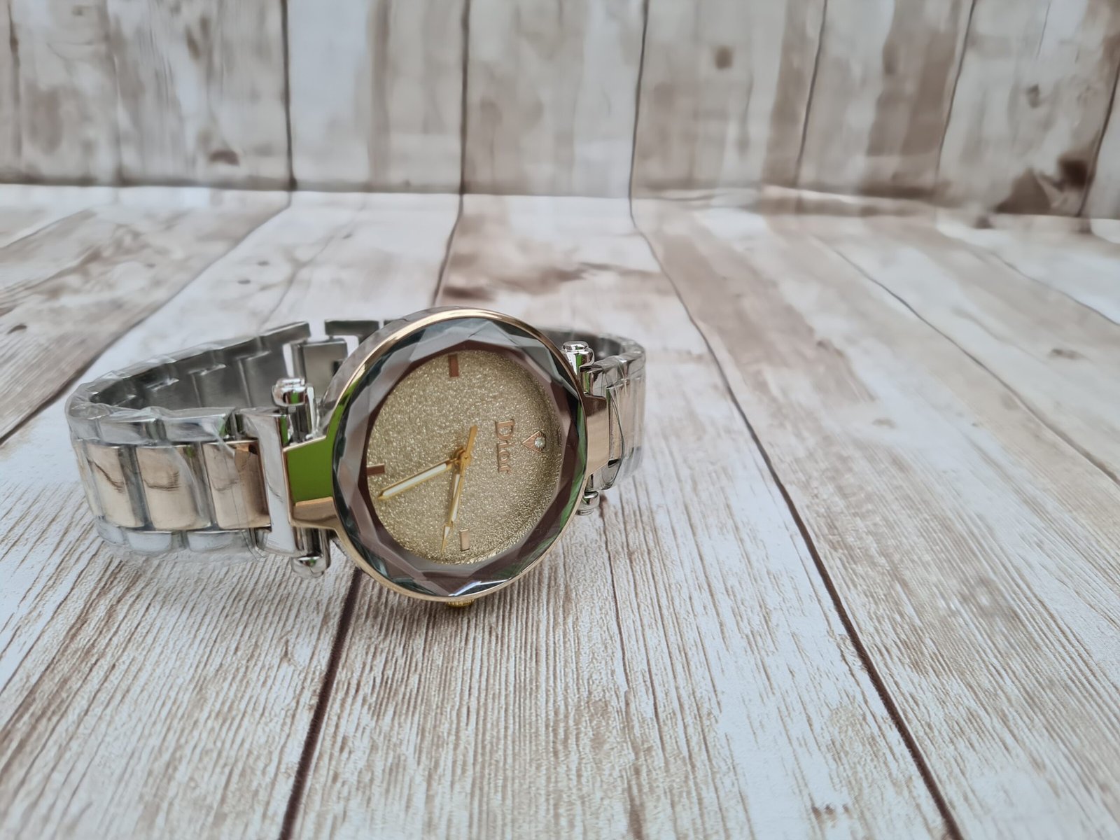 Montre de Luxe Bicolore – Boîtier à Facettes & Cadran Pailleté Or Solaire