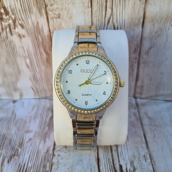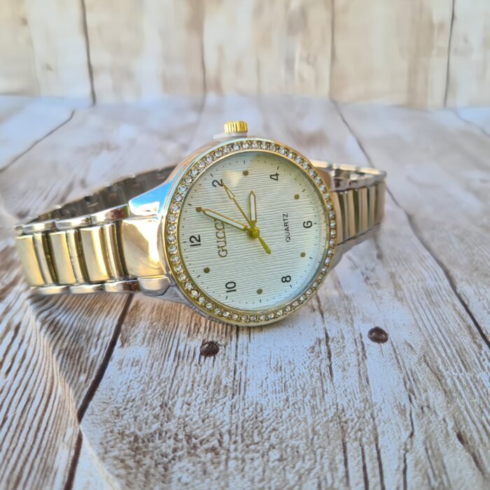 Éclat Cristallin : La lunette est soigneusement pavée de cristaux brillants, créant un halo de lumière autour d’un cadran blanc texturé aux lignes horizontales raffinées.