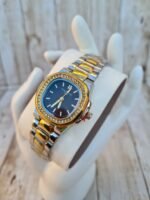 L’élégance à son apogée. Cette montre Patek Philippe Geneve combine un fini bicolore (argent et or) raffiné avec un cadran vert forêt profond. Sa lunette sertie de cristaux étincelants et son bracelet articulé en font une pièce d’exception pour un style à la fois moderne et intemporel.