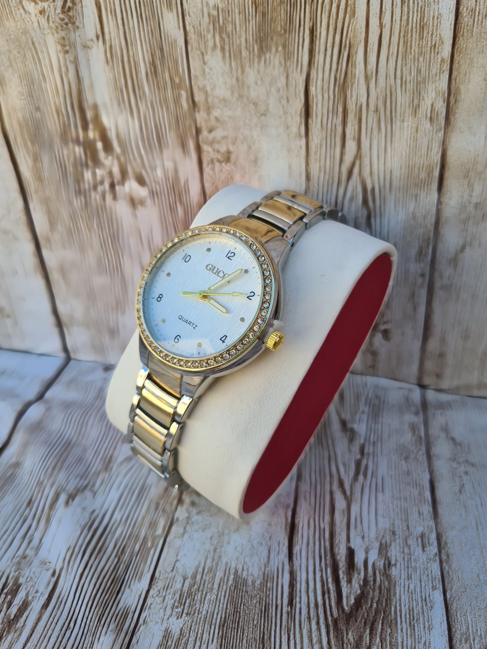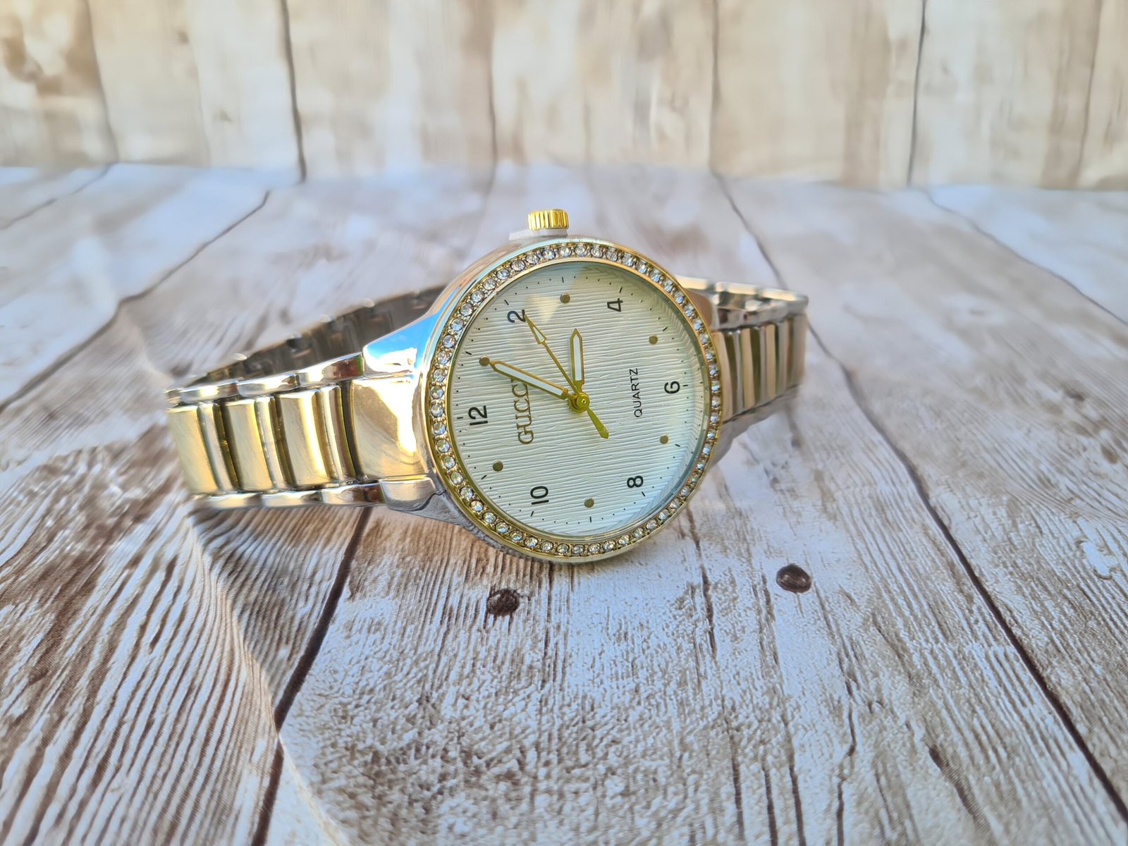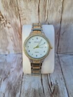 L’accessoire idéal pour illuminer votre poignet au quotidien. Cette montre combine un design bicolore sophistiqué, un cadran blanc à texture travaillée et une bordure étincelante pour une touche de luxe accessible.