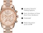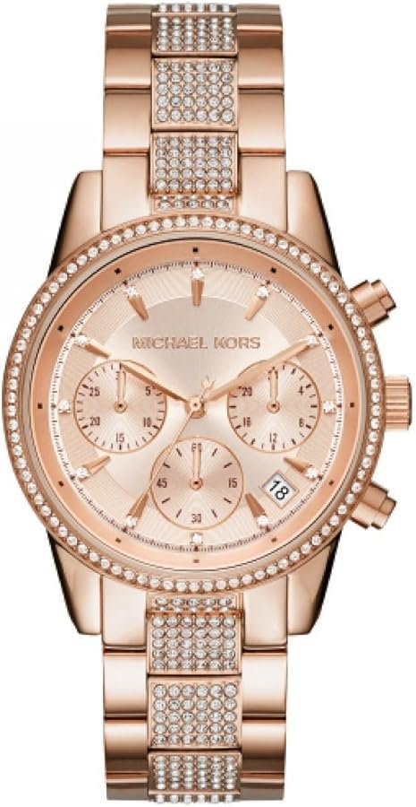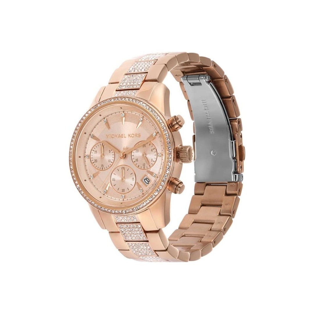 Cadran Sophistiqué : Le fond du cadran champagne est orné d’index bâtons dorés et de cristaux, avec le logo emblématique Michael Kors bien visible.